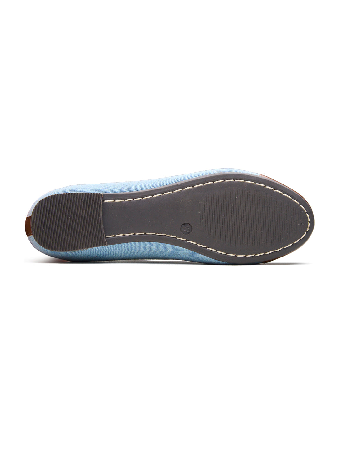 Step into chic comfort with these ballerina flats. Designed with a soft fabric body in pastel blue and a smooth brown faux leather toe cap, they feature a dainty bow with metallic tips for a stylish finish. Lightweight and versatile, these flats are perfect for adding a trendy twist to your everyday outfits.
